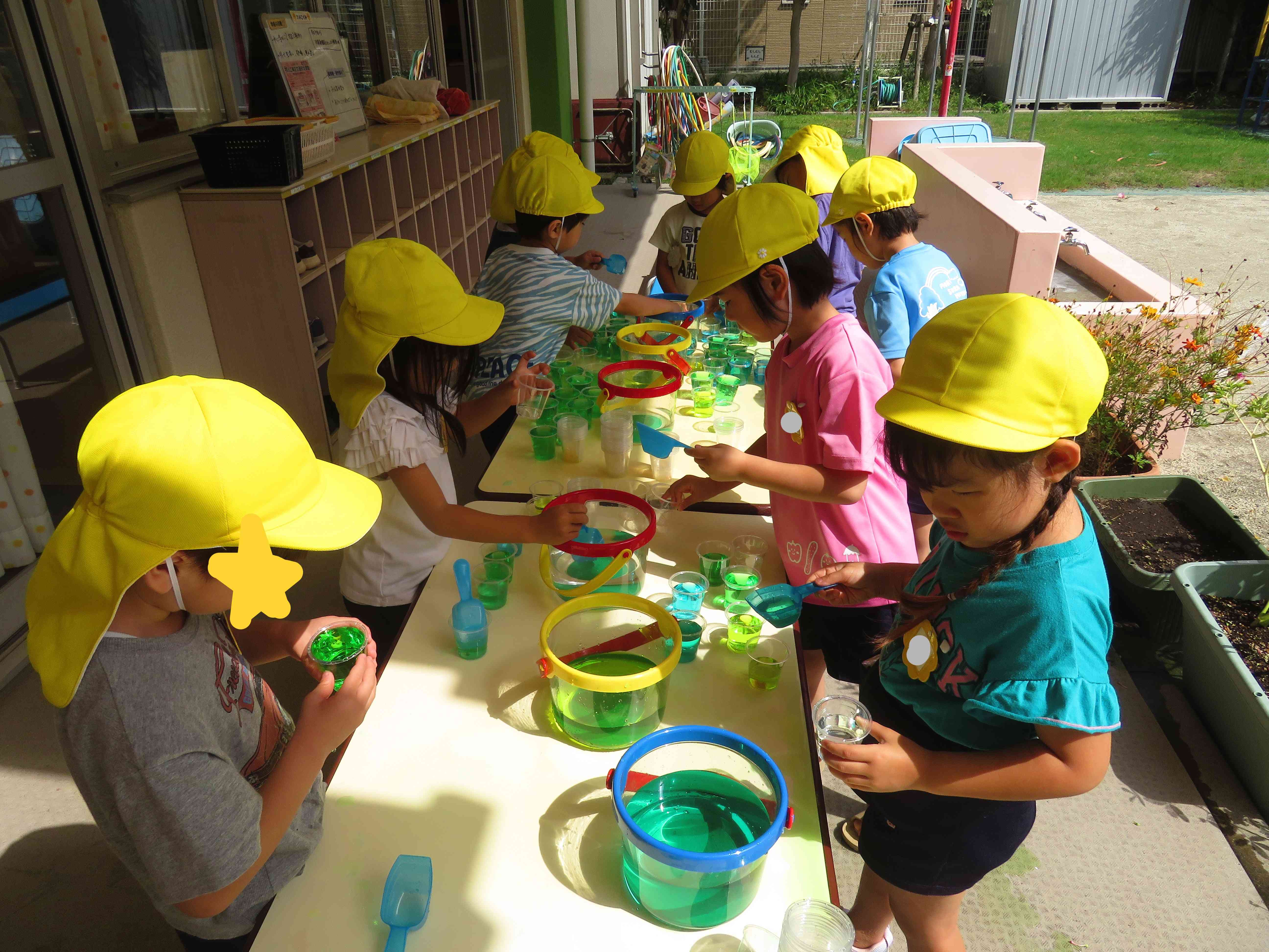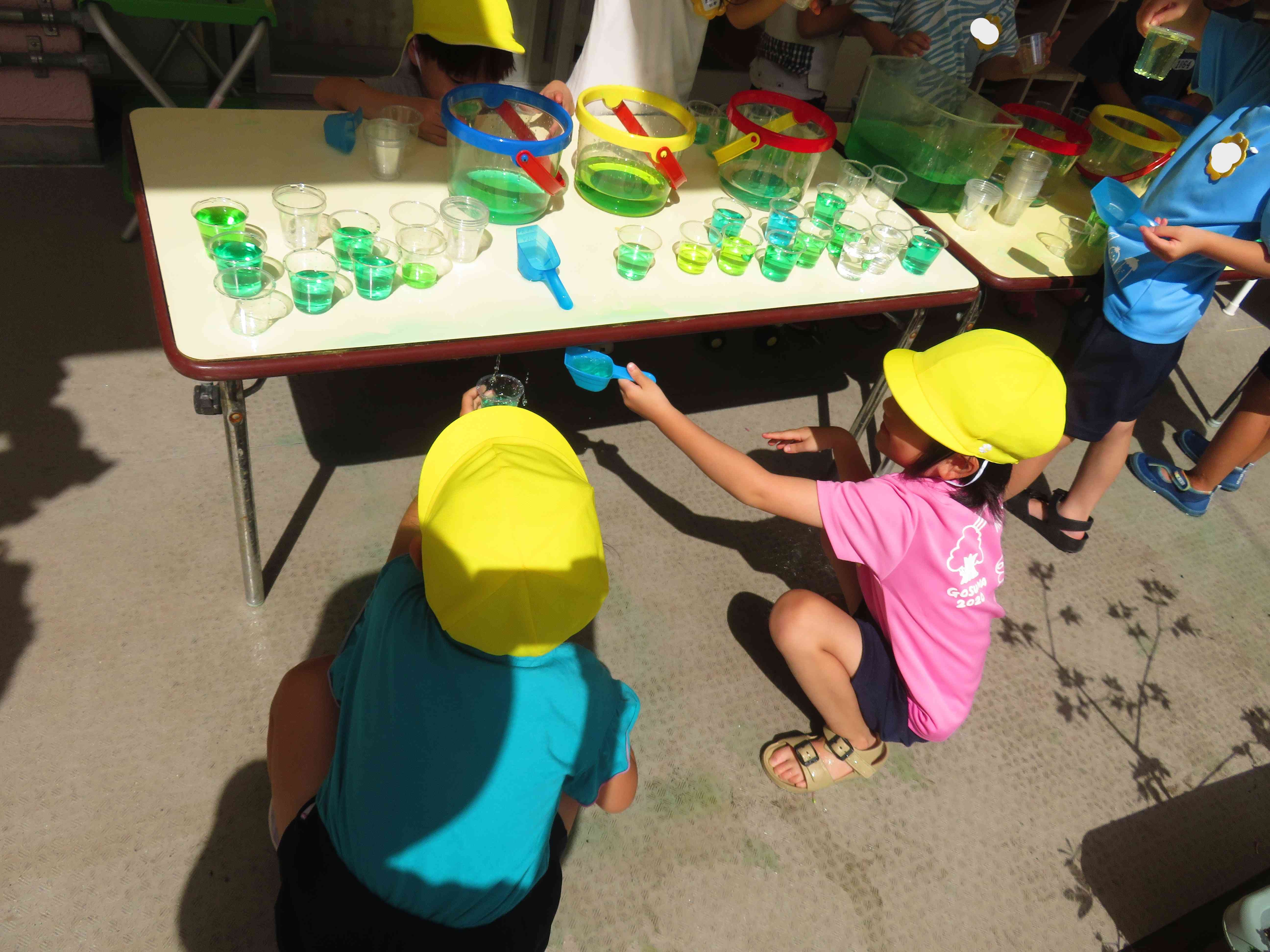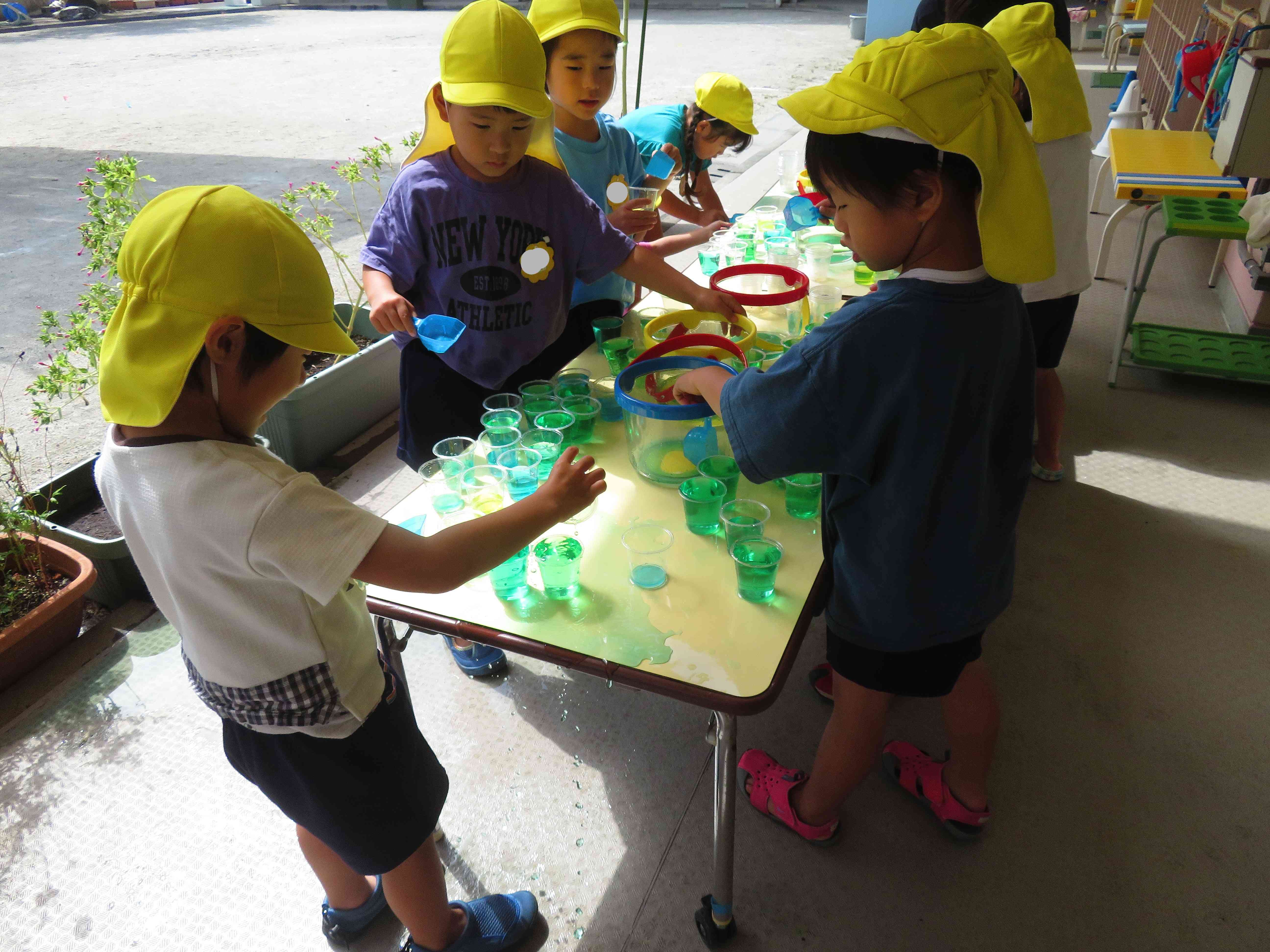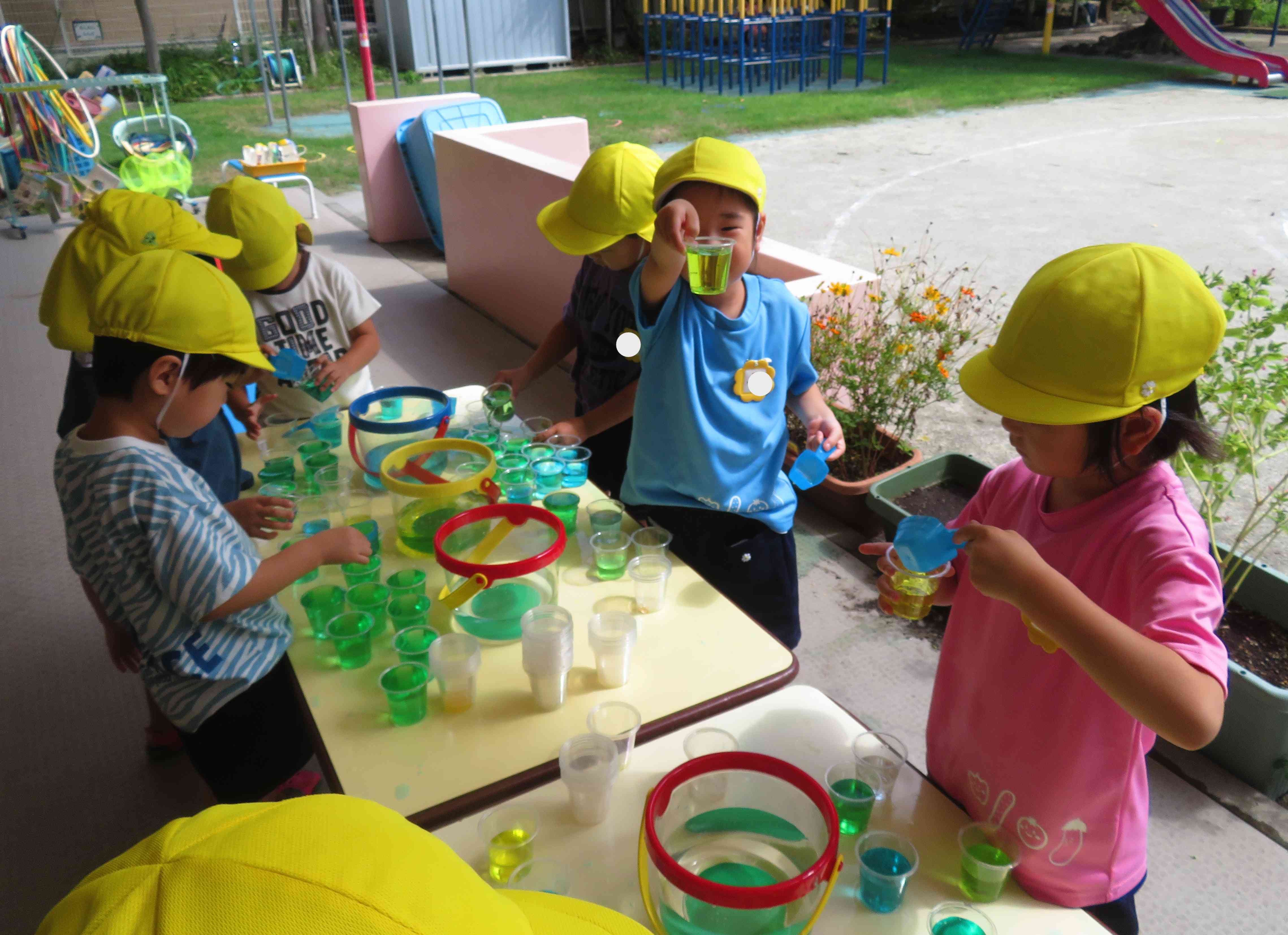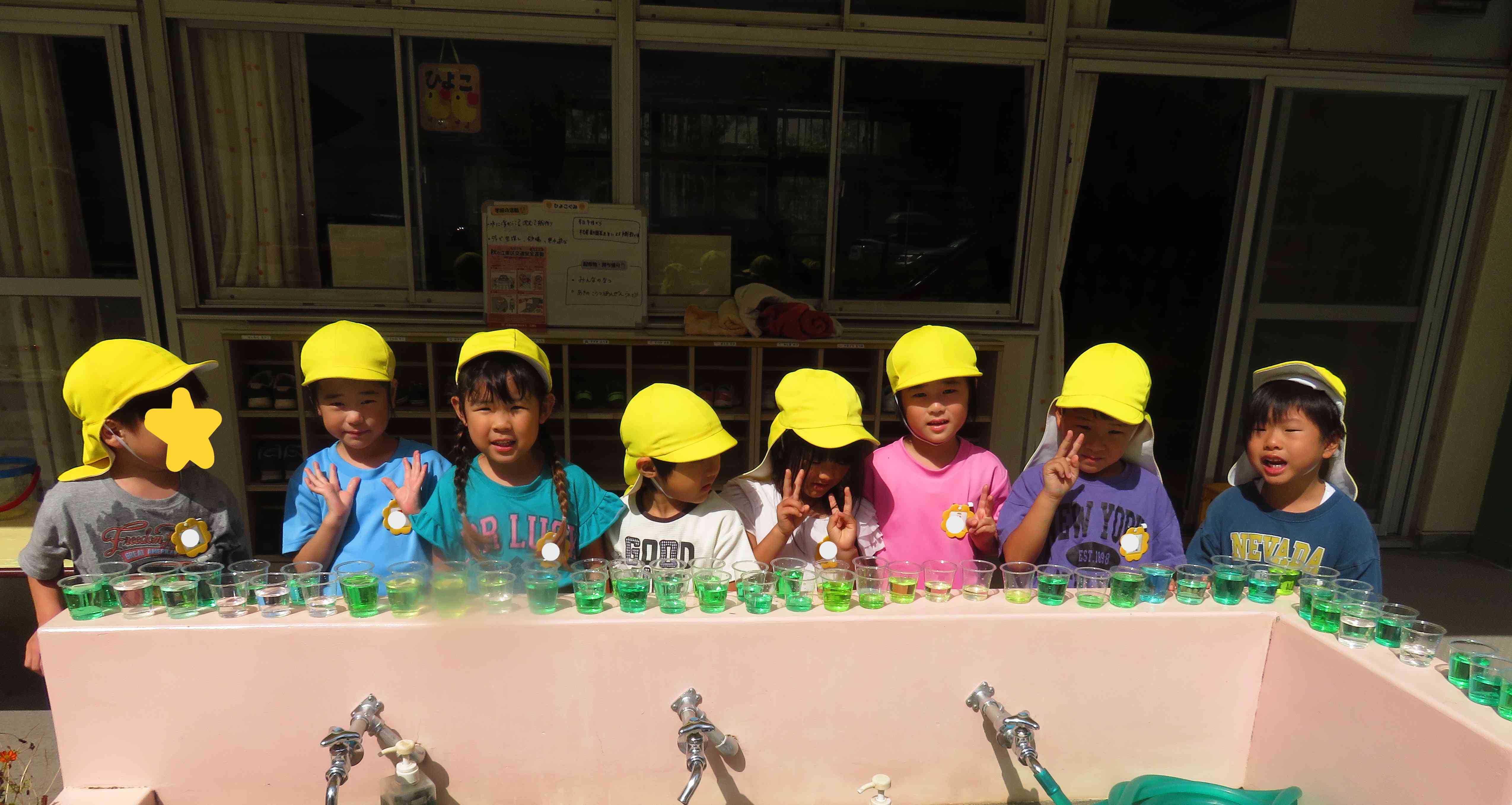 今日の色水は、青色・黄色・透明の水でした。 昨日の色水遊びの経験や以前やった様々な色のスライム遊びの経があるからか、今日の色水を見た途端に「今日は緑色のジュースを作ろう♪」「でも緑ってないよ」「本当だ!緑になった」…と。それぞれが青色、黄色、水の分量を試しながら、「黄緑色ができた」「メロンソーダの色」「ミントの色」…様々な緑色を作って楽しみました。ほかにも青の色水と透明な水、そしてまた青…「海の青にするんだ」とイメージを膨らませる子もいました。また、こぼれた色水が流れ落ちる様子を見付け、落ちてくる色水を集めて楽しむ姿も見られました。 最後に、一つ一つ違った緑色の色水カップを全部並べて写真を撮りました☆【添付ファイル】