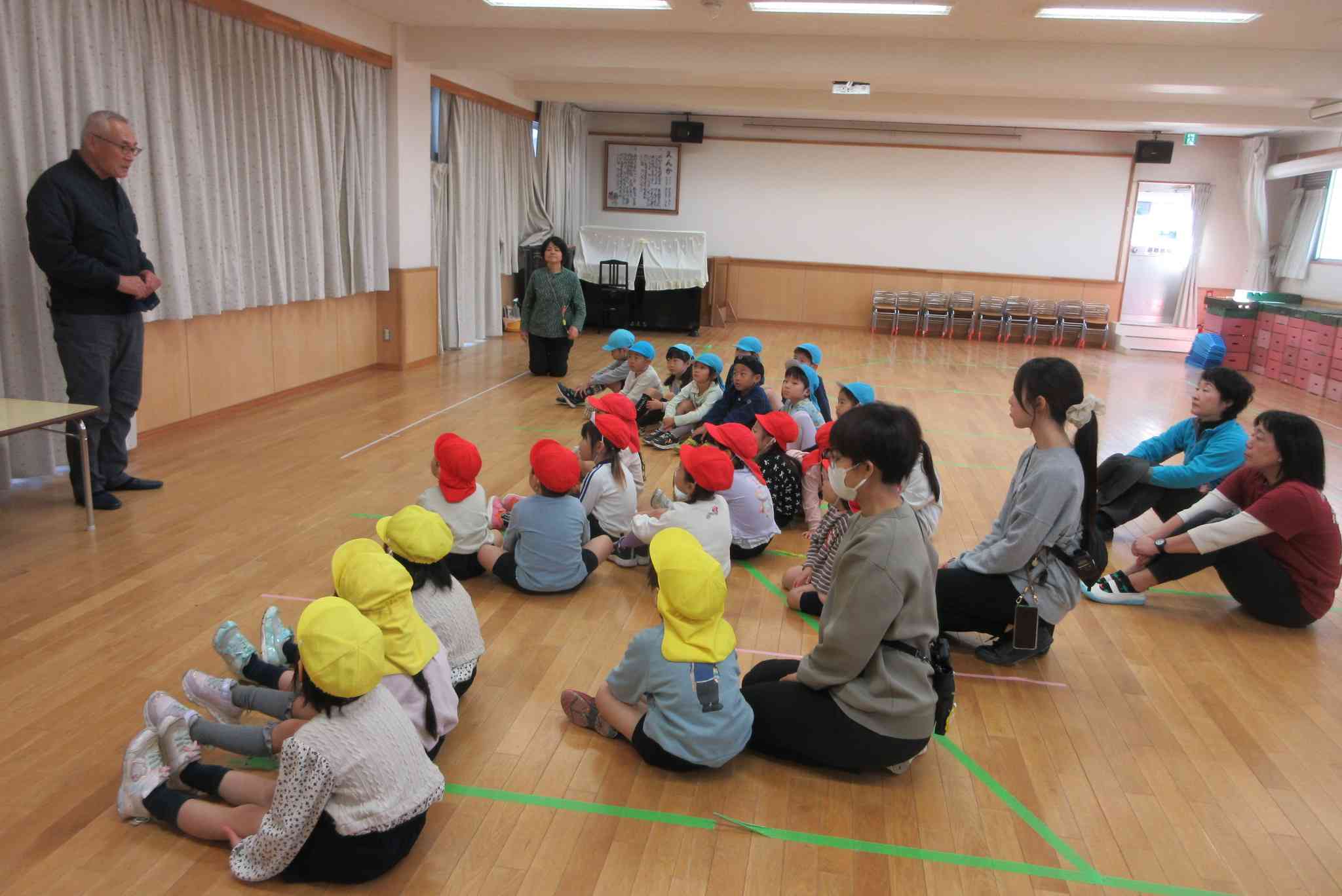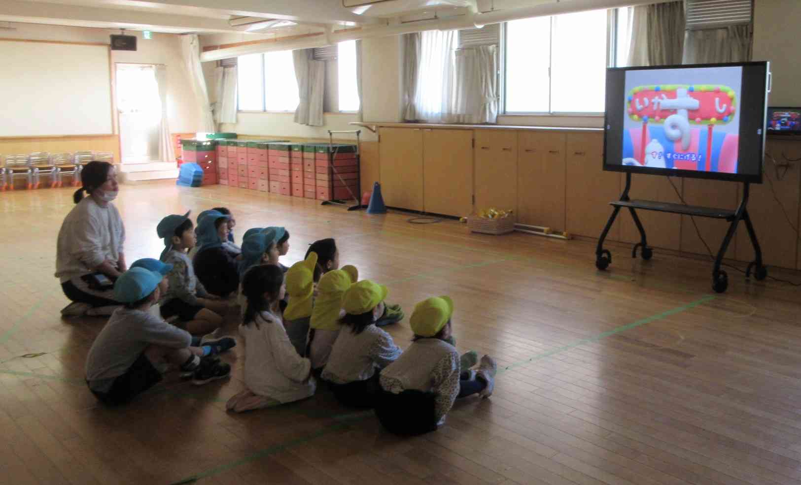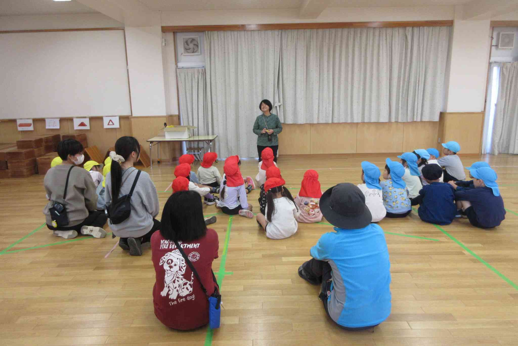 今年度2回目の不審者が侵入したことを想定しての避難訓練でした。今日は、城東警察署の防犯課から警察官が来てくださり、不審者侵入時の応の仕方や避難の仕方のご指導を受けました。 不審者の役が園庭に現れると、園庭で楽しく遊んでいたこどもたちは、先生の指示を聞いて速やかに室内に入り、安全な場所へ先生と一緒に避難しました。警察が駆け付けたところで訓練は終了。みんな真剣に訓練に取り組めました。教員もさすまたの使い方や対応・避難の仕方を再確認しました。 訓練後、年中・年長組は、「い・か・の・お・す・し」の約束についてDVDを視聴したり、お話を聞いたりして、知らない人についていかないことを学びました。【添付ファイル】