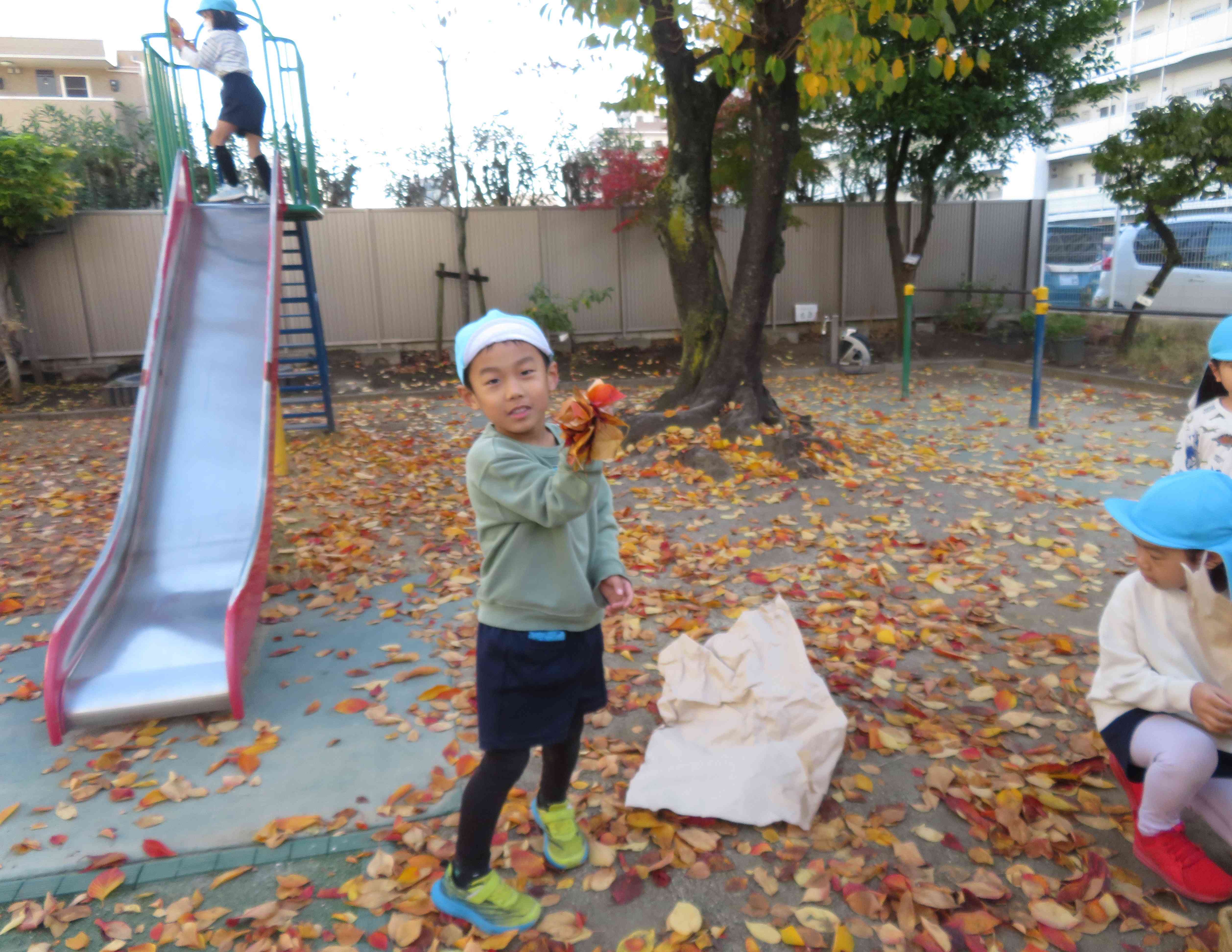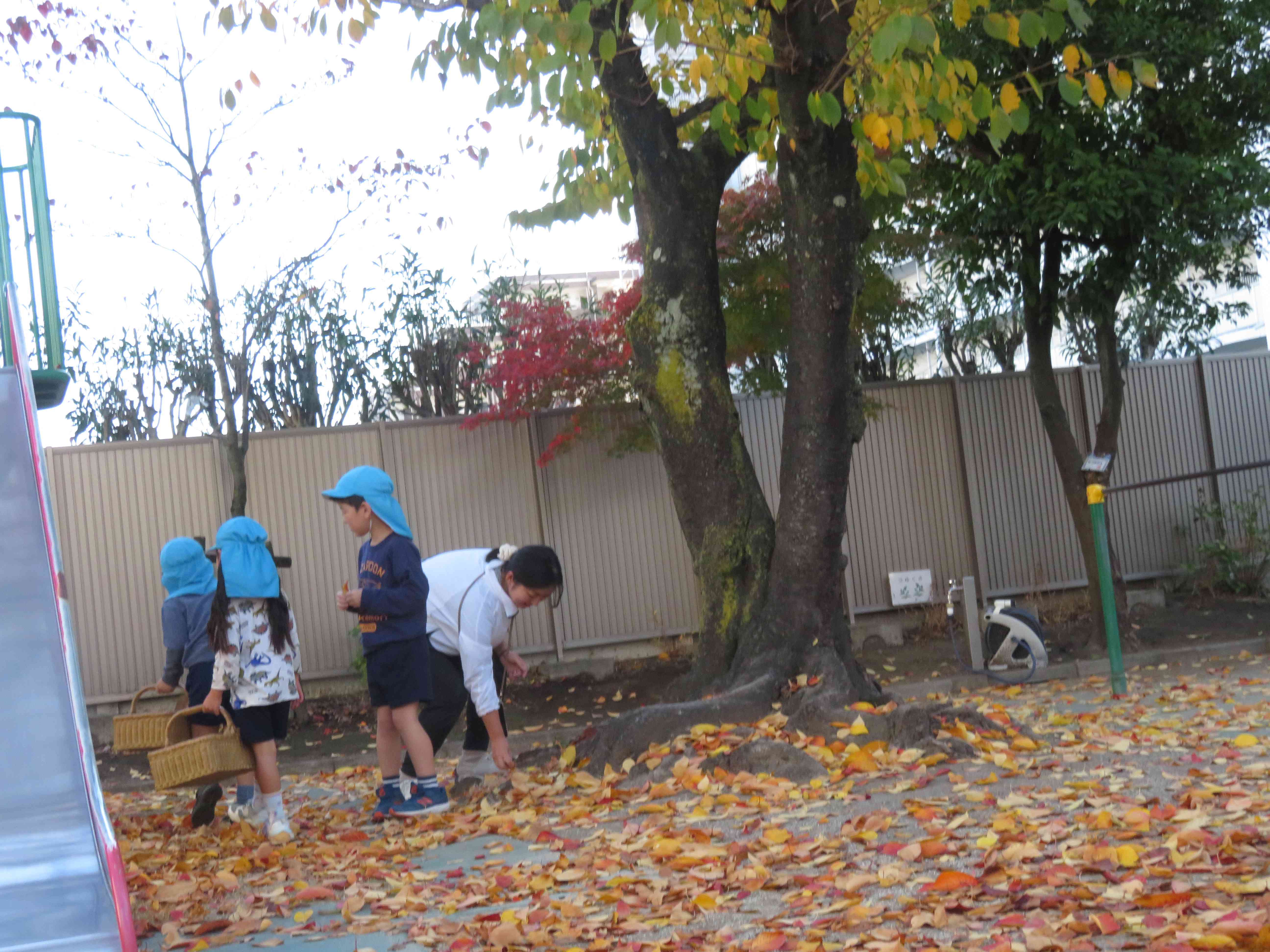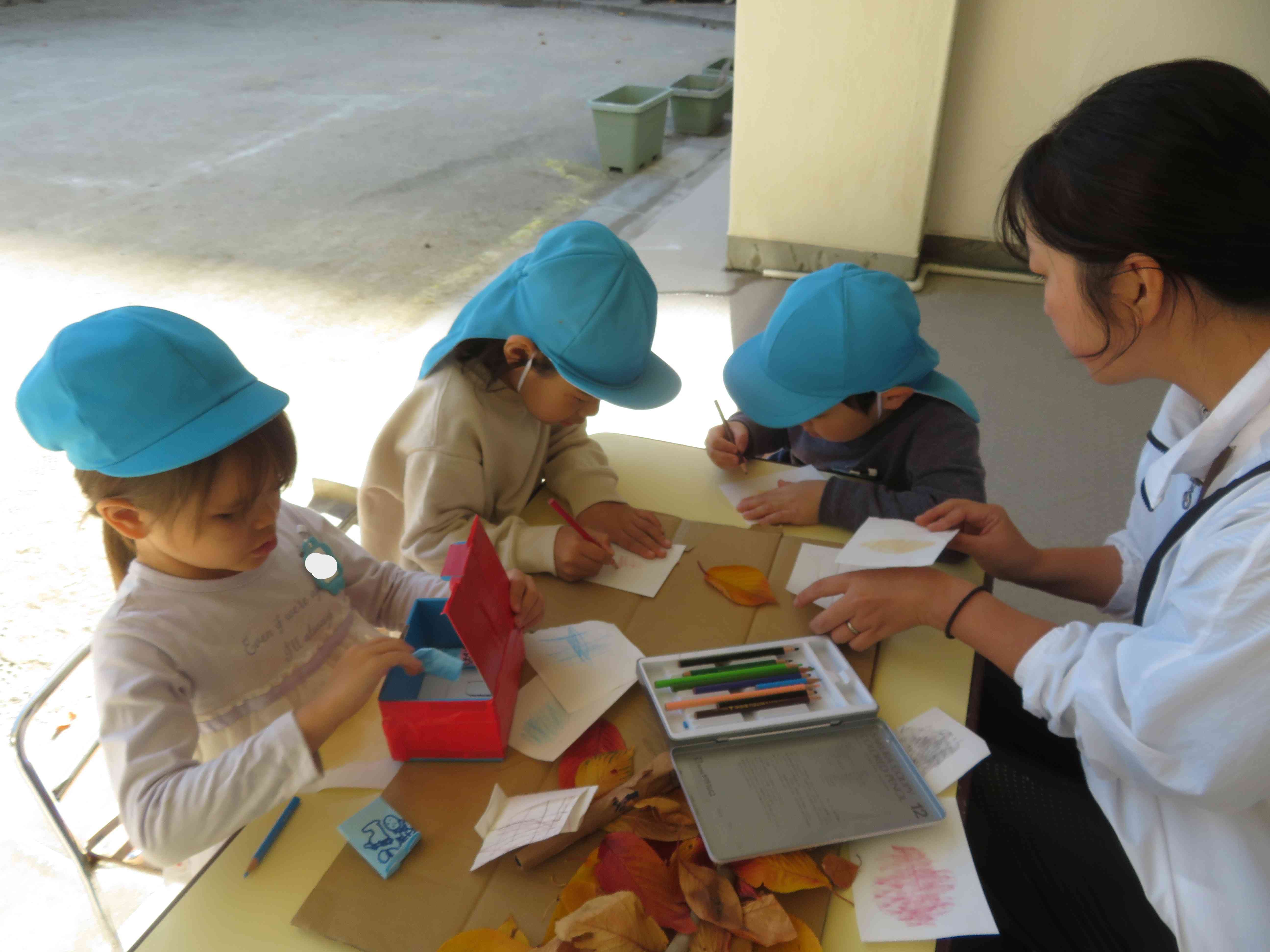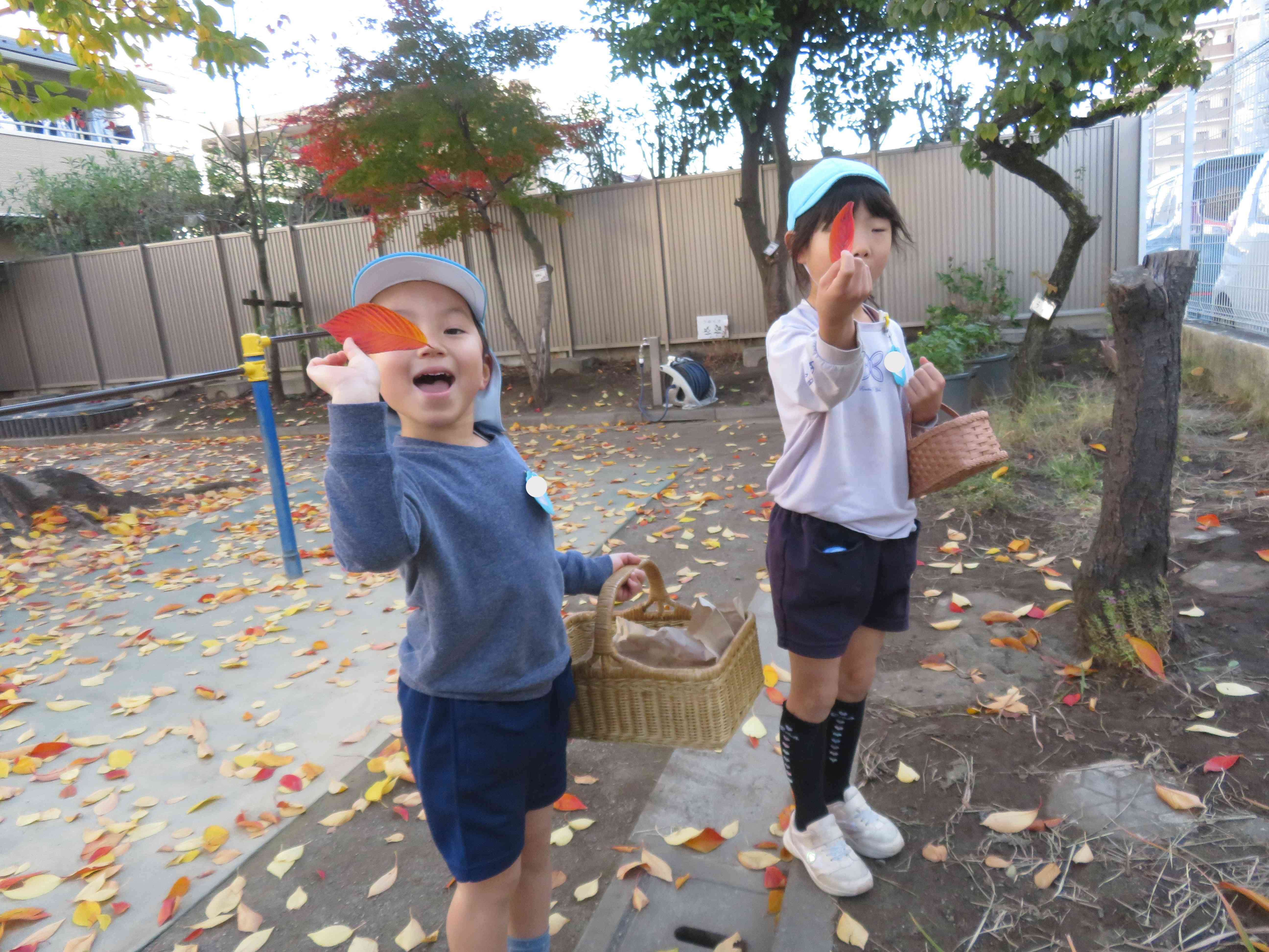 園庭の桜の木の下に赤や黄色、オレンジ色などきれいに色付いた葉っぱがたくさん落ちて、園庭に絨毯が敷かれたようでした。年長そら組さんは、「わぁ!きれい!!」と、カゴに落ち葉を集めたり、滑り台の上から、葉っぱを降らせたりして遊びました。また、拾った葉っぱに薄紙を乗せて、その上から色鉛筆でこすり絵(フロッタージュ)にして、葉っぱを写して遊びました。この季節ならではの落ち葉遊び。見たり、触れたり、匂いを嗅いだりして、心を揺り動かしながら、豊かな体験をしたいですね。【添付ファイル】