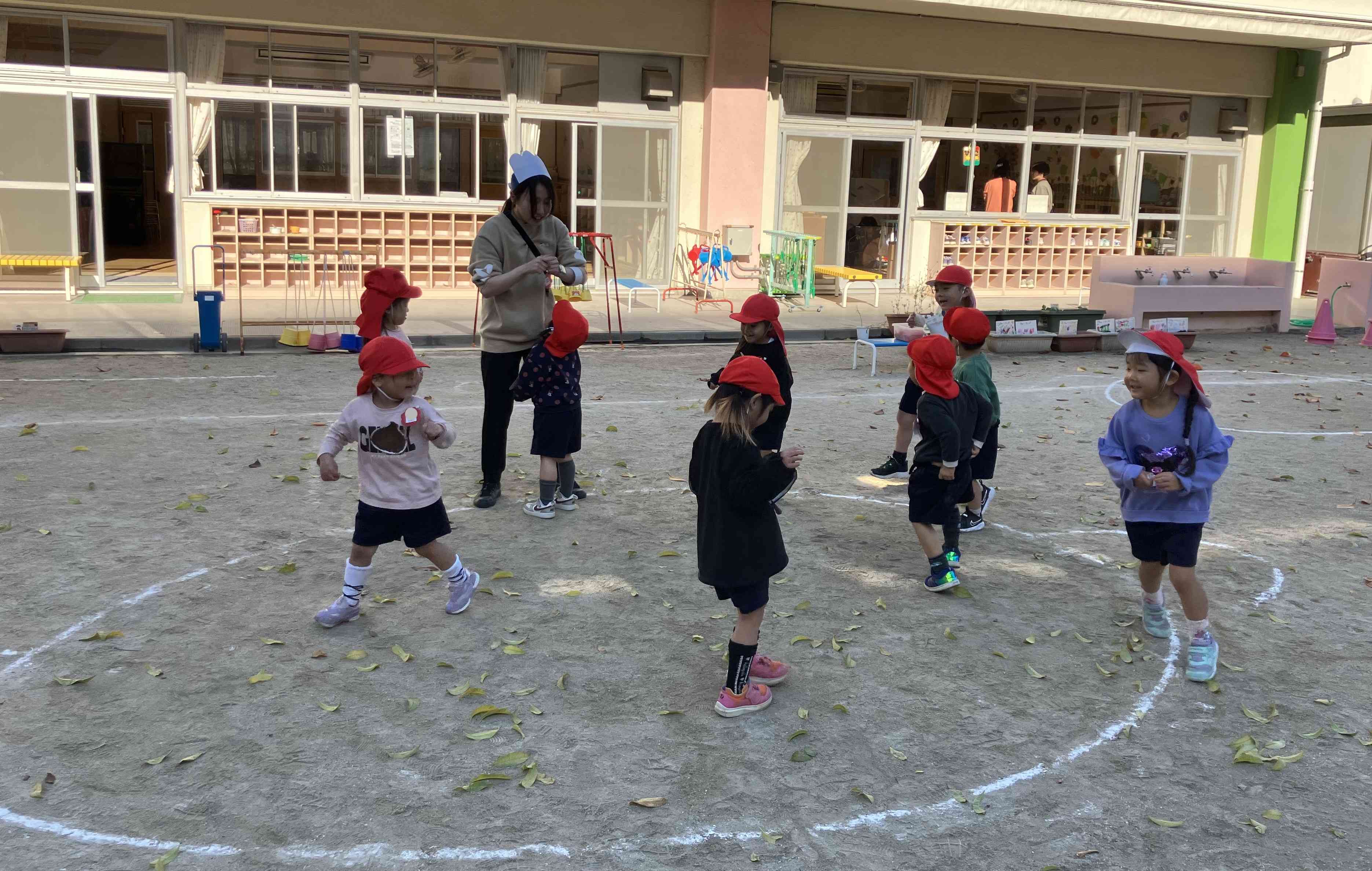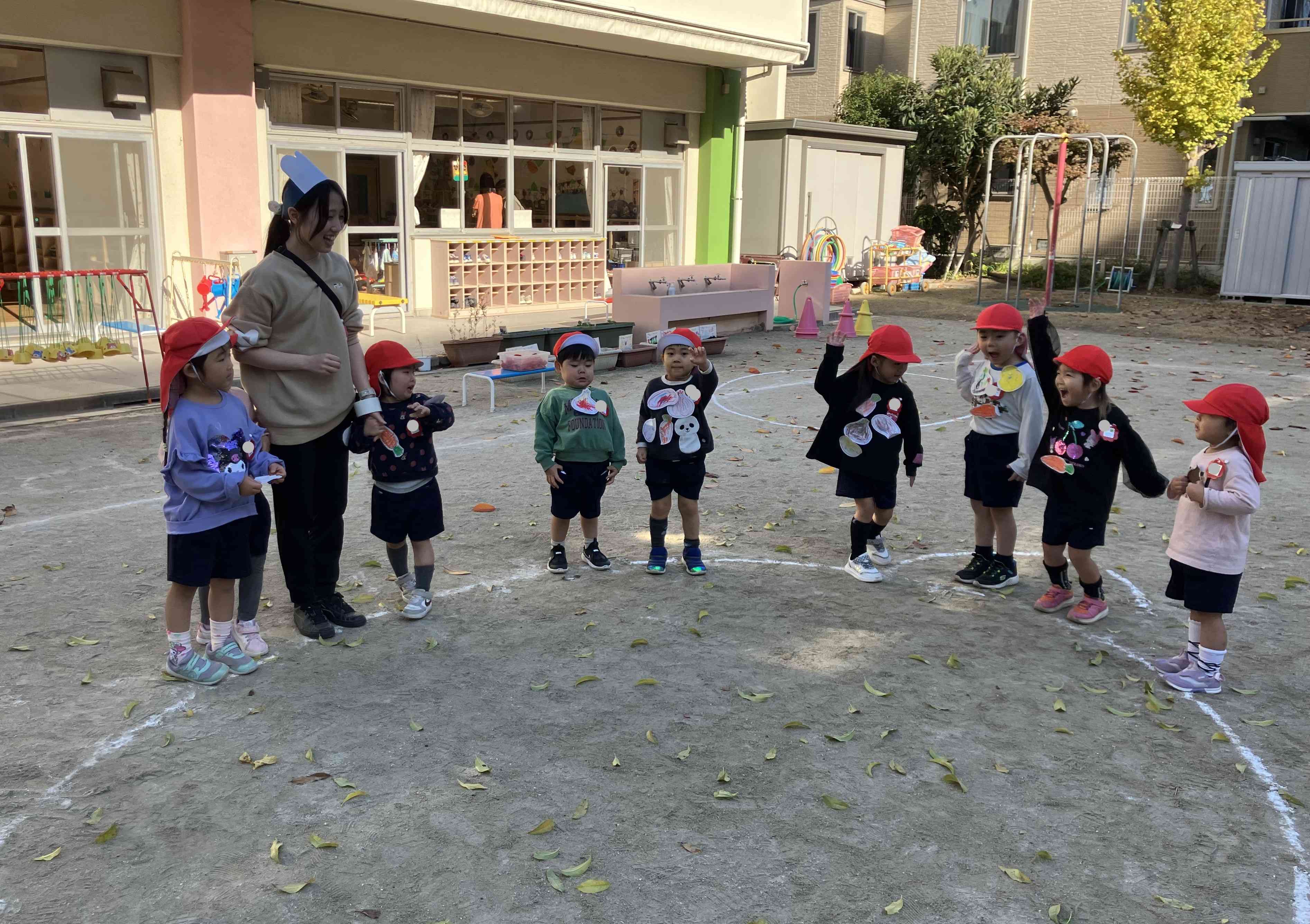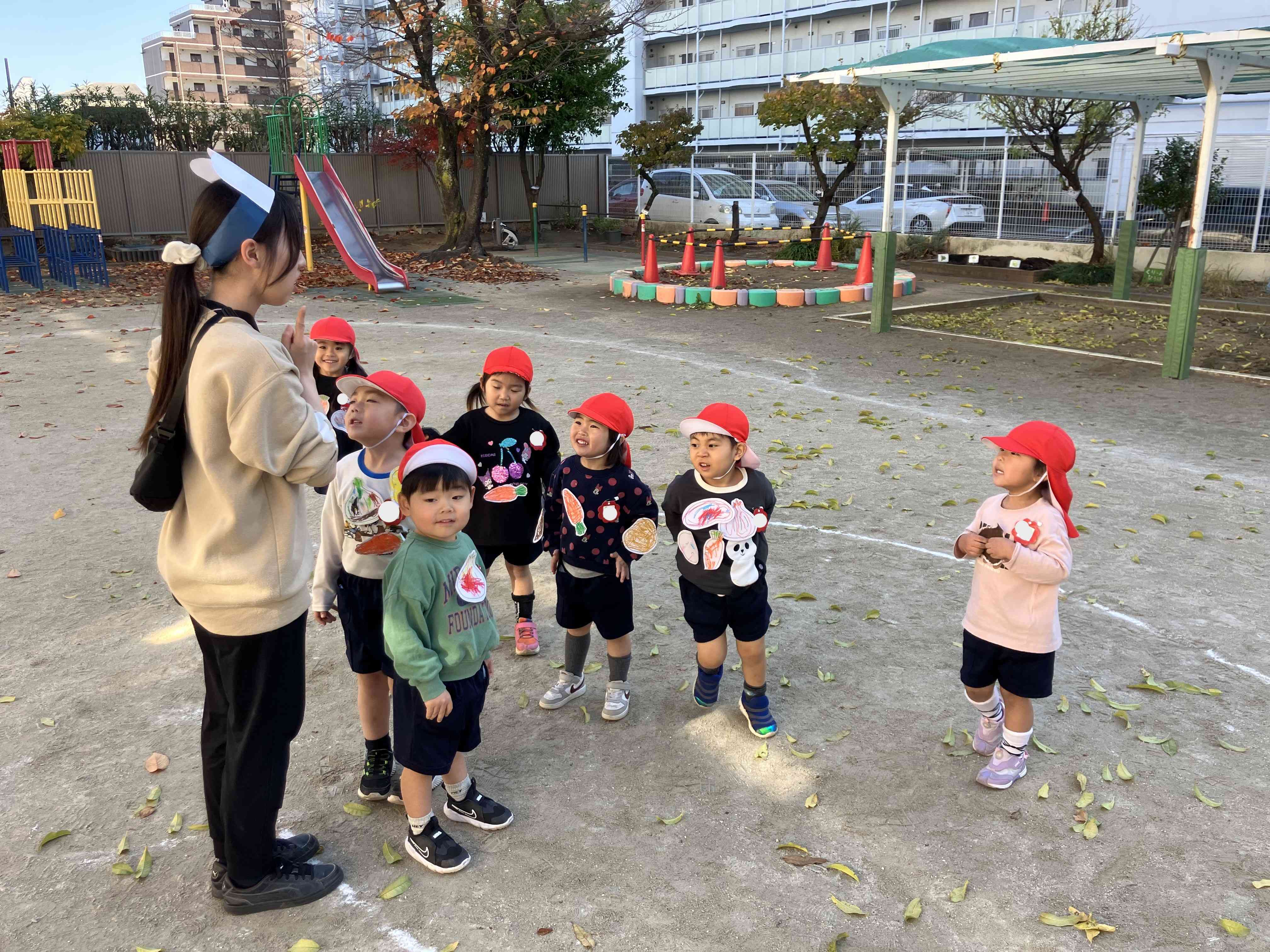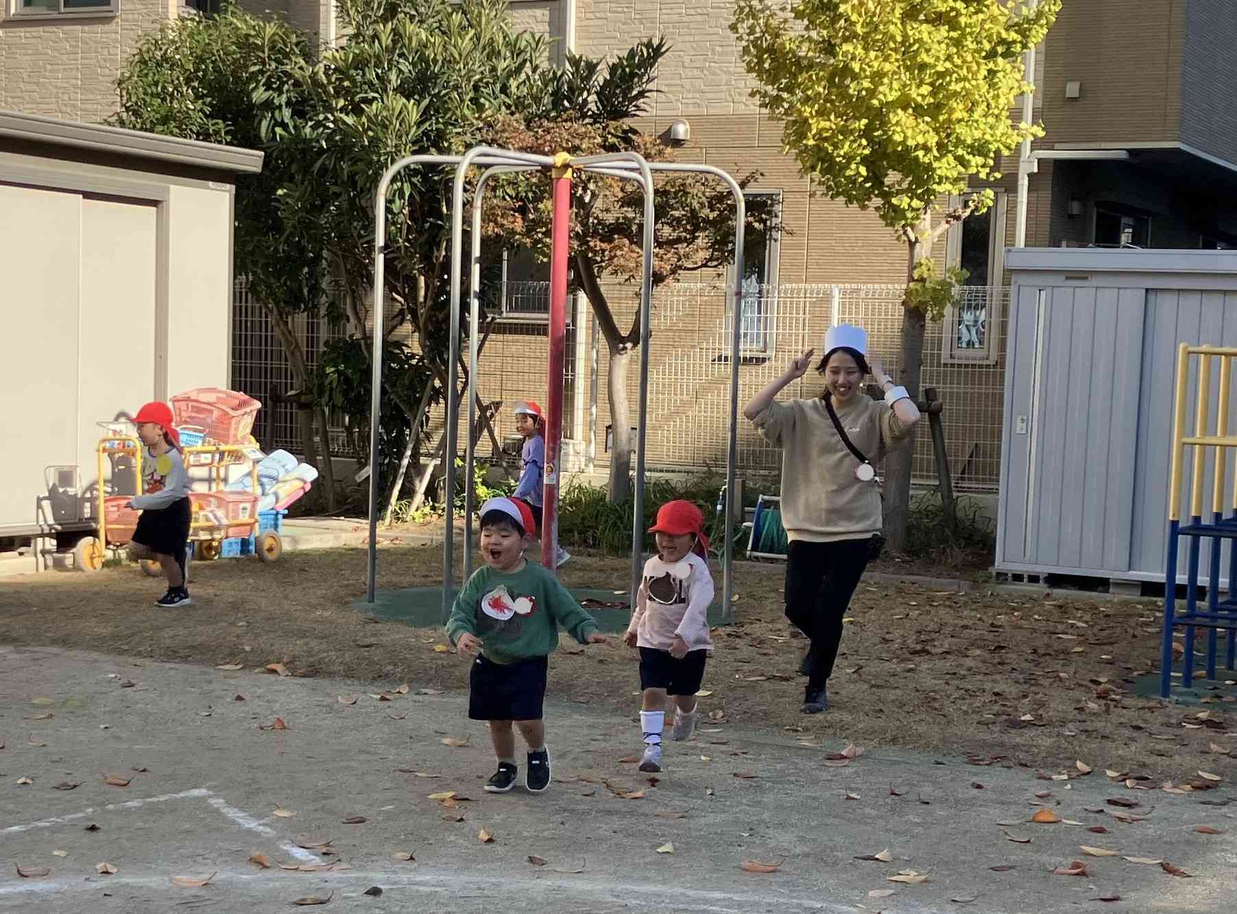 年少いちご組さんは、みんなで「カレーライス鬼」という鬼遊びをしました。先生がコックさんになり、こどもたちはニンジンやジャガイモ、玉ねぎ、お肉などのカレーの具材になります。コックさんが「ニンジンさーん!」と呼び掛けると「はーい!」と返事をしたこどもたちは、園庭に描かれたお鍋に入ります。お肉やジャガイモ、玉ねぎなどみんなお鍋に入ったら、おいしいカレーの出来上がり!コックさんの「いただきま~す!」の声を合図にお鍋の具たちは、コックさんに捕まらないように慌てて逃げ出します。 このようにイメージをもちながらの鬼遊びを年少組はたっぷりと楽しんでいきます♪【添付ファイル】