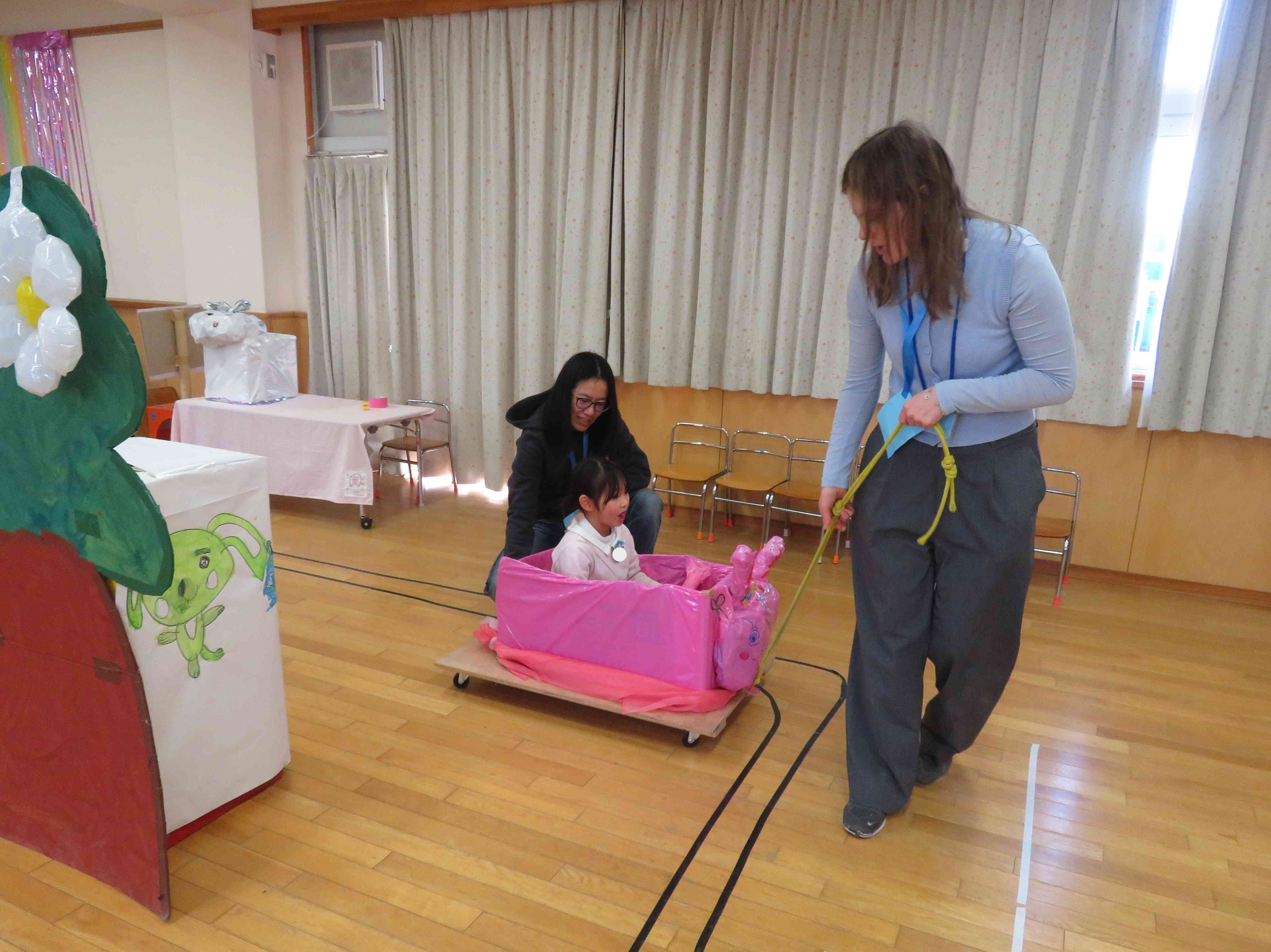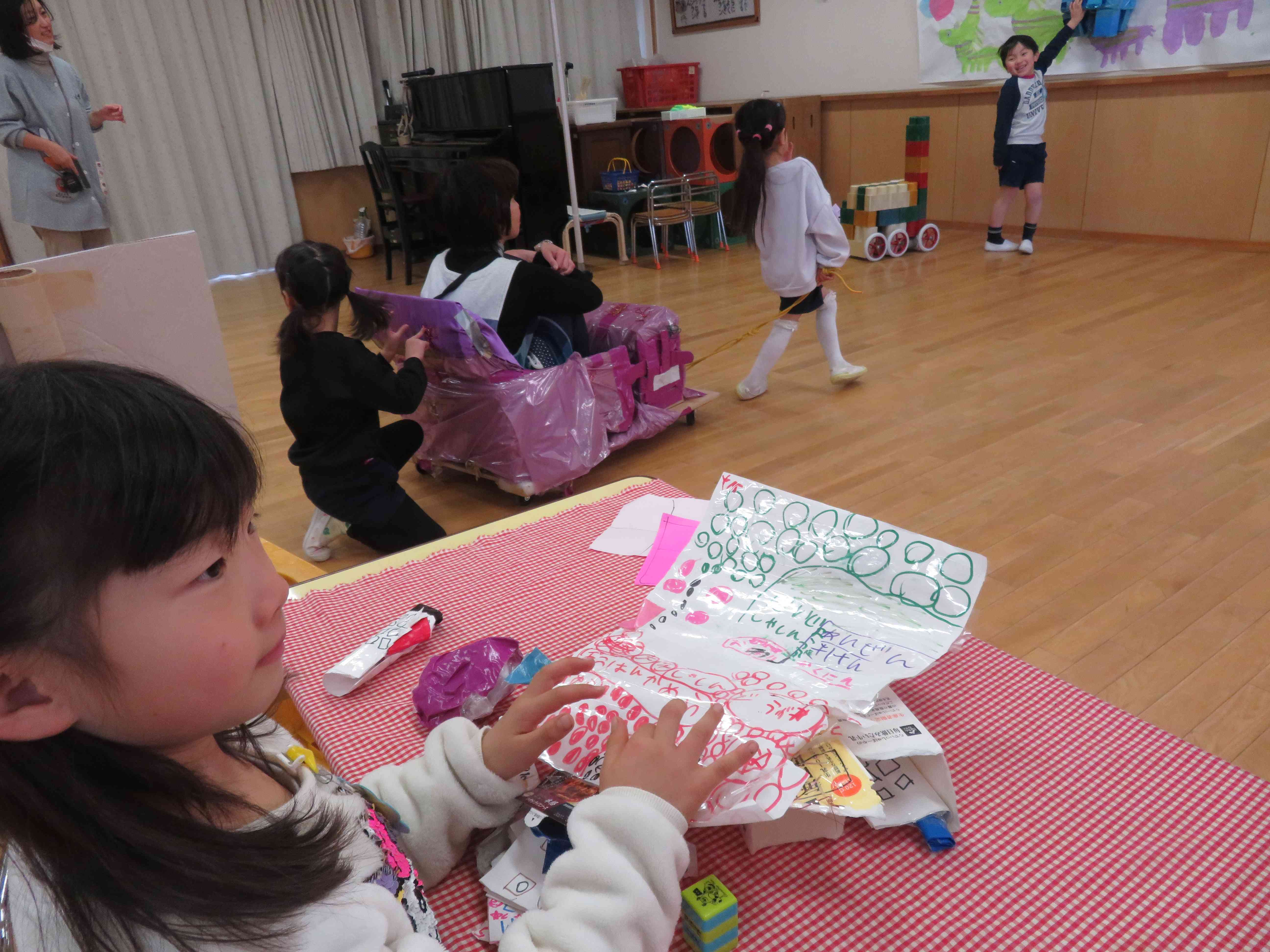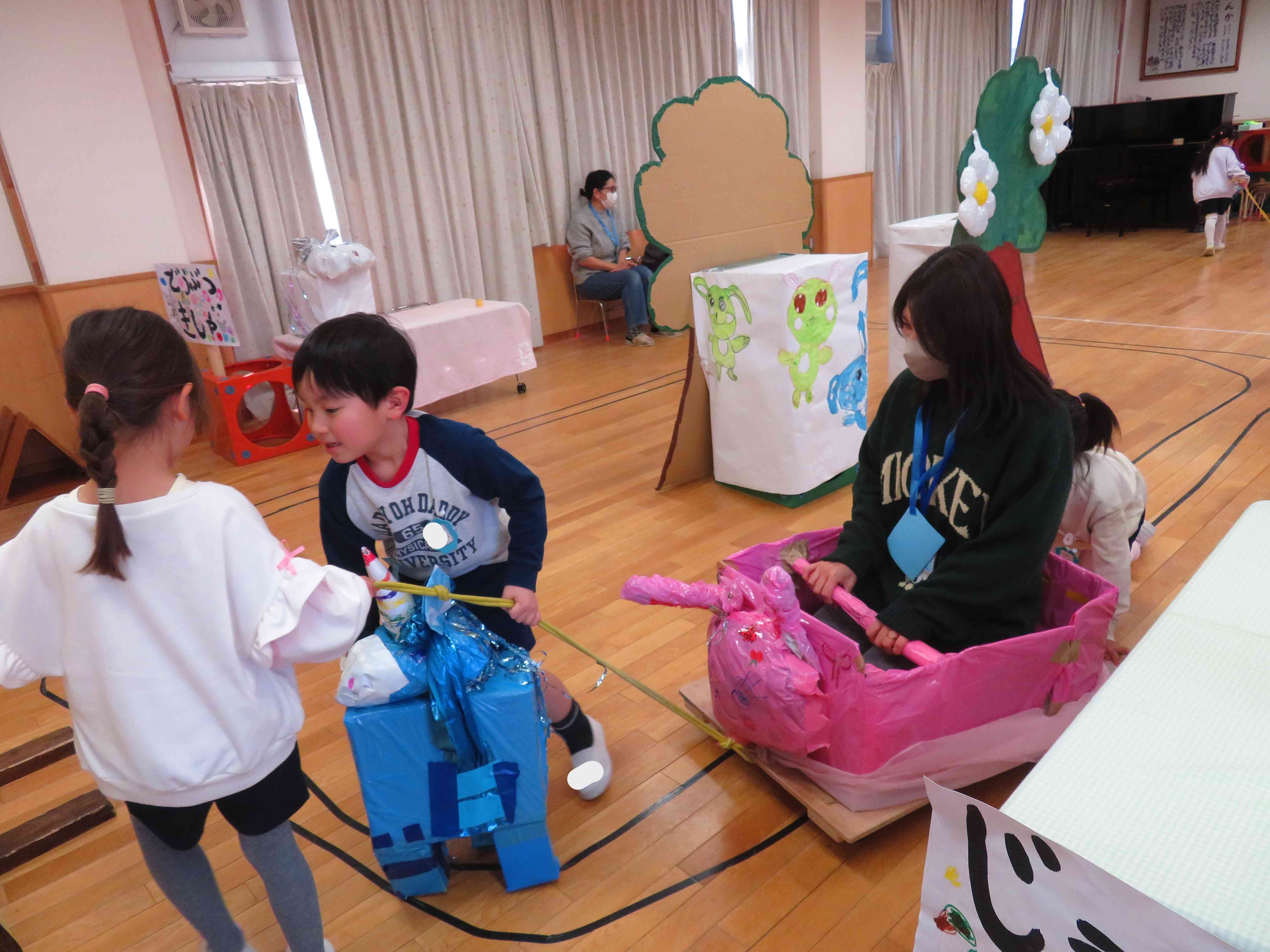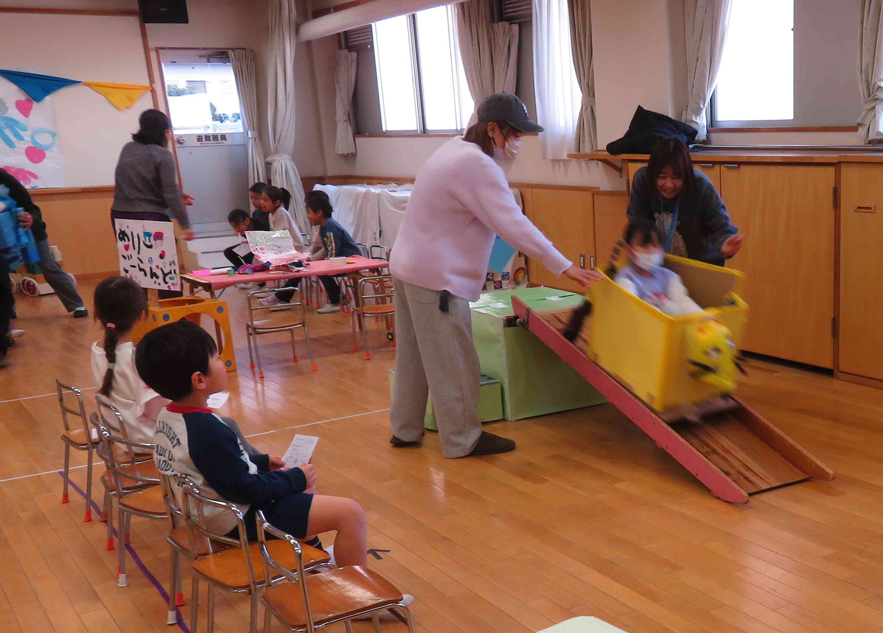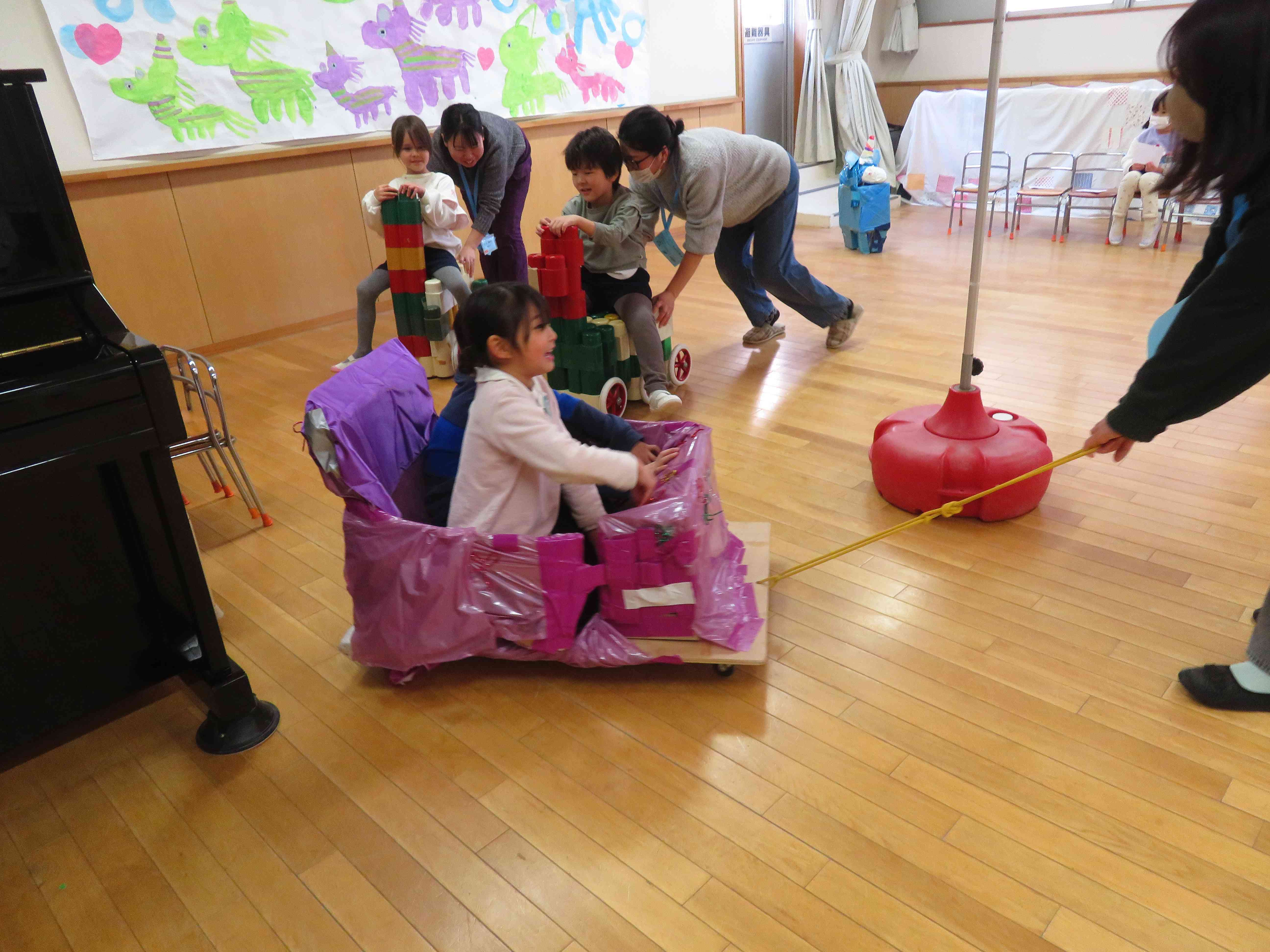 年長そら組さんが毎日準備してきた遊園地ごっこ「ごすなランド」にお家の方をご招待しました。乗り物は「メリーゴーランド」「ジェットコースター」「どうぶつ汽車」。 お客さんは、乗り物の入り口でチケットを見せると、係のこどもたちはスタンプを押してくれ、順番に案内してくれます。大人が乗るので、乗り物を動かすこどもたちは、乗り物を引いたり、後ろから押したりしていました。こどもたちは、自分の役割が分かって、友達と力を合わせて取り組む姿がたくさん見られました♪ そして後半は、保護者の方とこどもたちが役割を交代して、お家の方が乗り物の係、こどもたちがお客さんになって遊びました。みんな笑顔がいっぱいの一日になりました♪【添付ファイル】