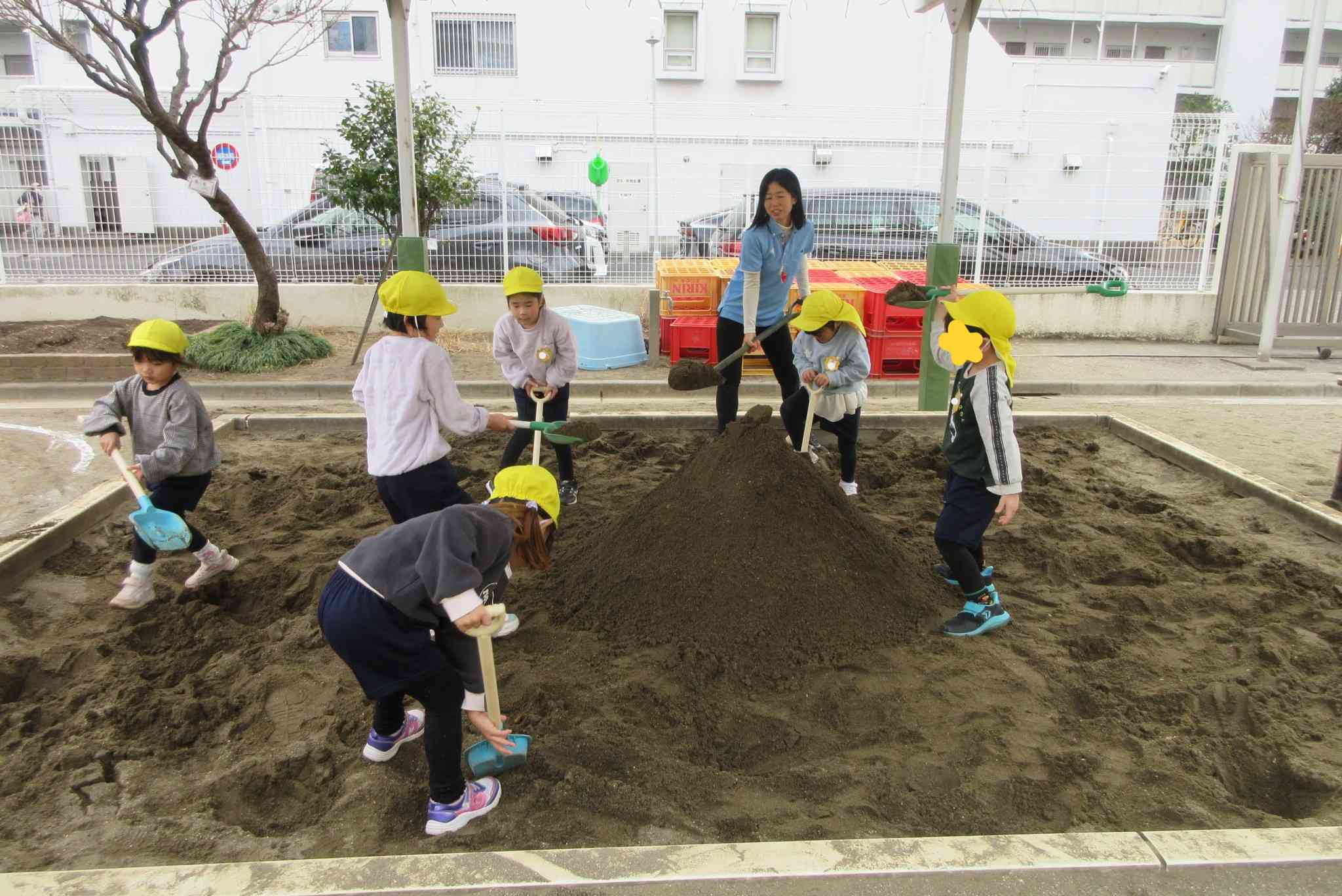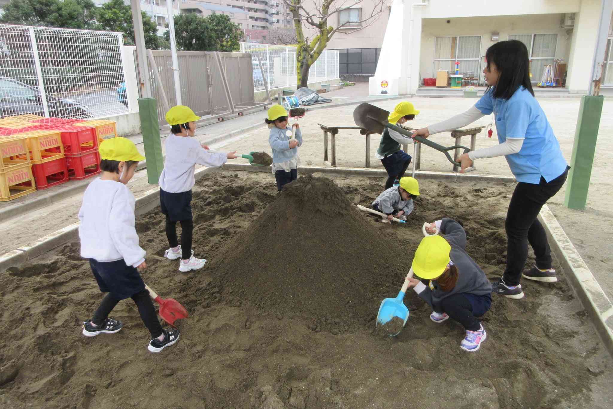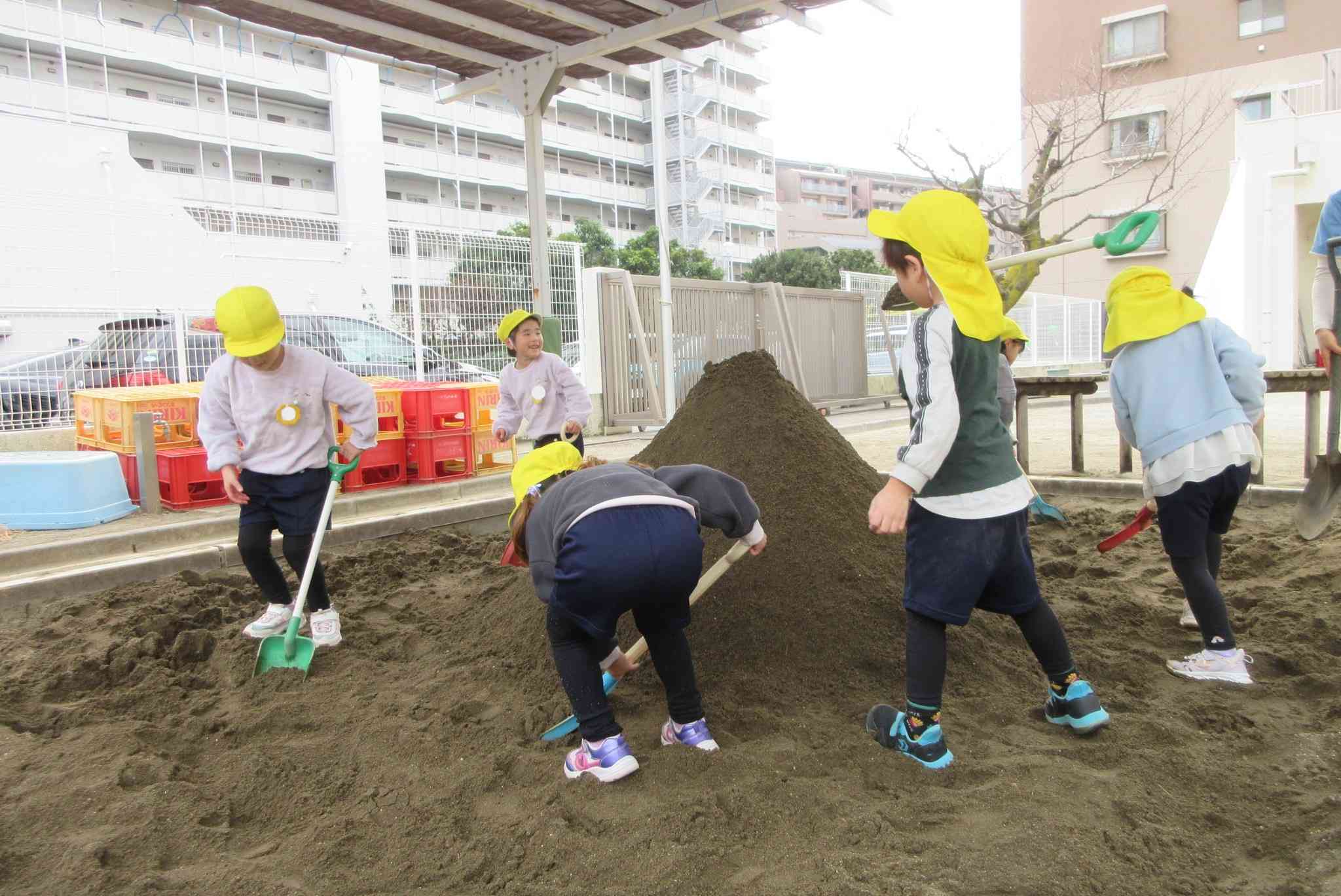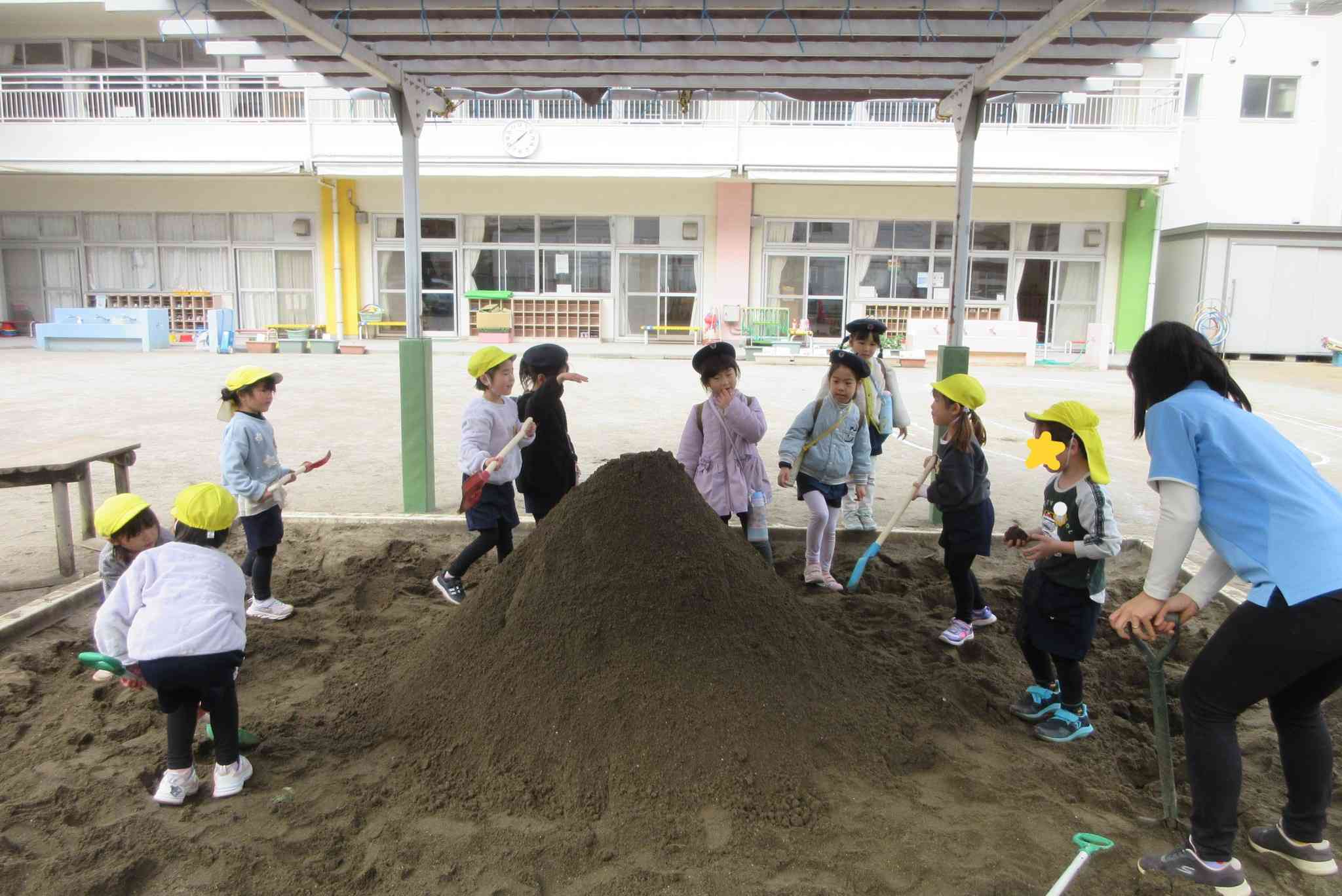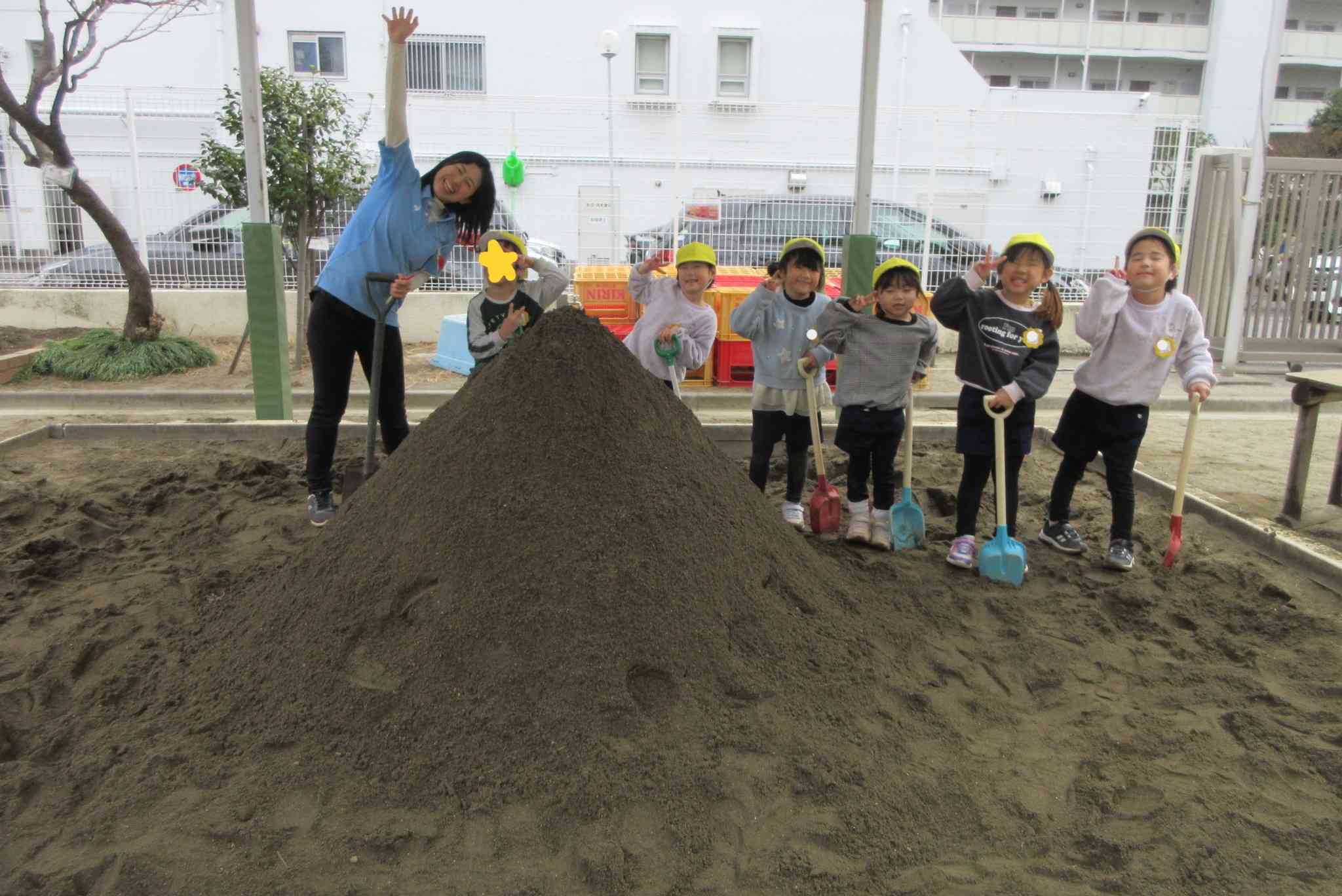 今日の年中ひよこ組は、欠席のお友達が多めだったので、6人と担任の先生7人で、砂場で山つくりをしました。大きなスコップをそれぞれが持ってきて砂を盛り始めると、最初は小さな山だったのが、みんなの力でどんどん大きくなり、とうとう富士山のような大きな大きな山になりました♪ 区民農園にほうれん草の収穫に出掛ける前の年長そら組さんが、この大きな山を見付けて駆け寄り、「ひよこ組がつくったの?」「本当にすごいね!!」「〇〇ちゃんの背よりも大きい!」と、ビックリしていました。 みんなの力を合わせると、こんなにすごいことができるんだね、と学級の仲間意識も高まった遊びでした♪【添付ファイル】