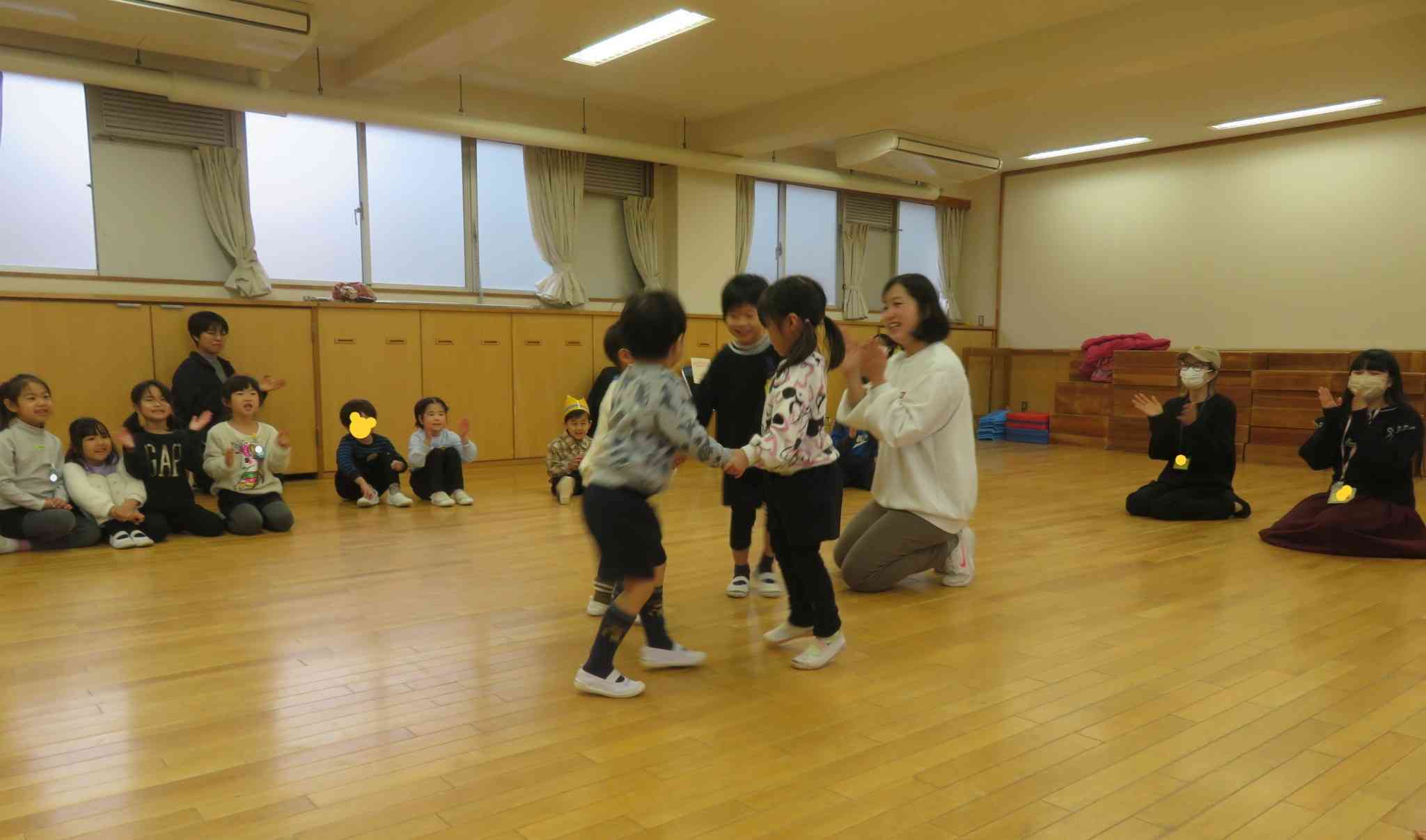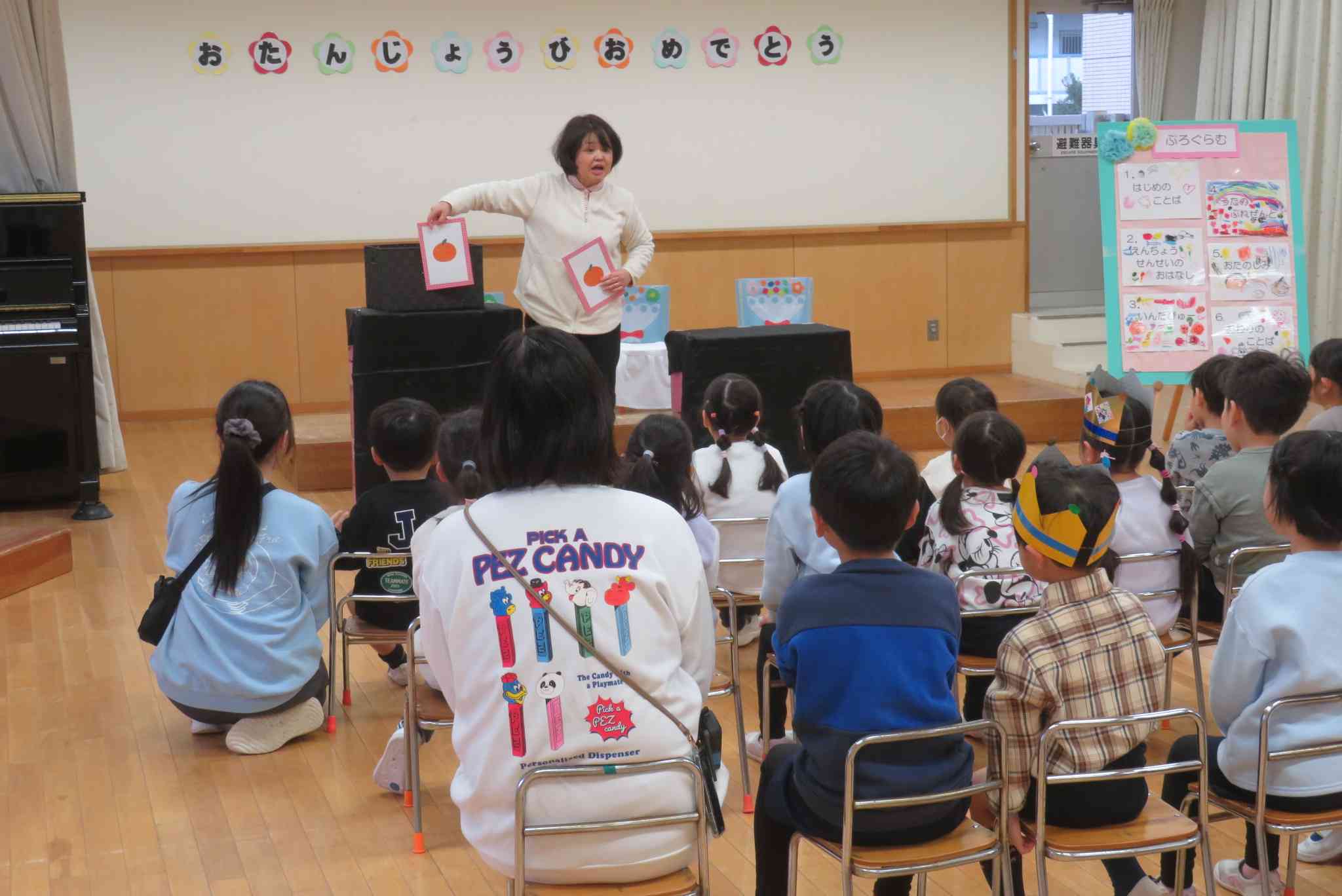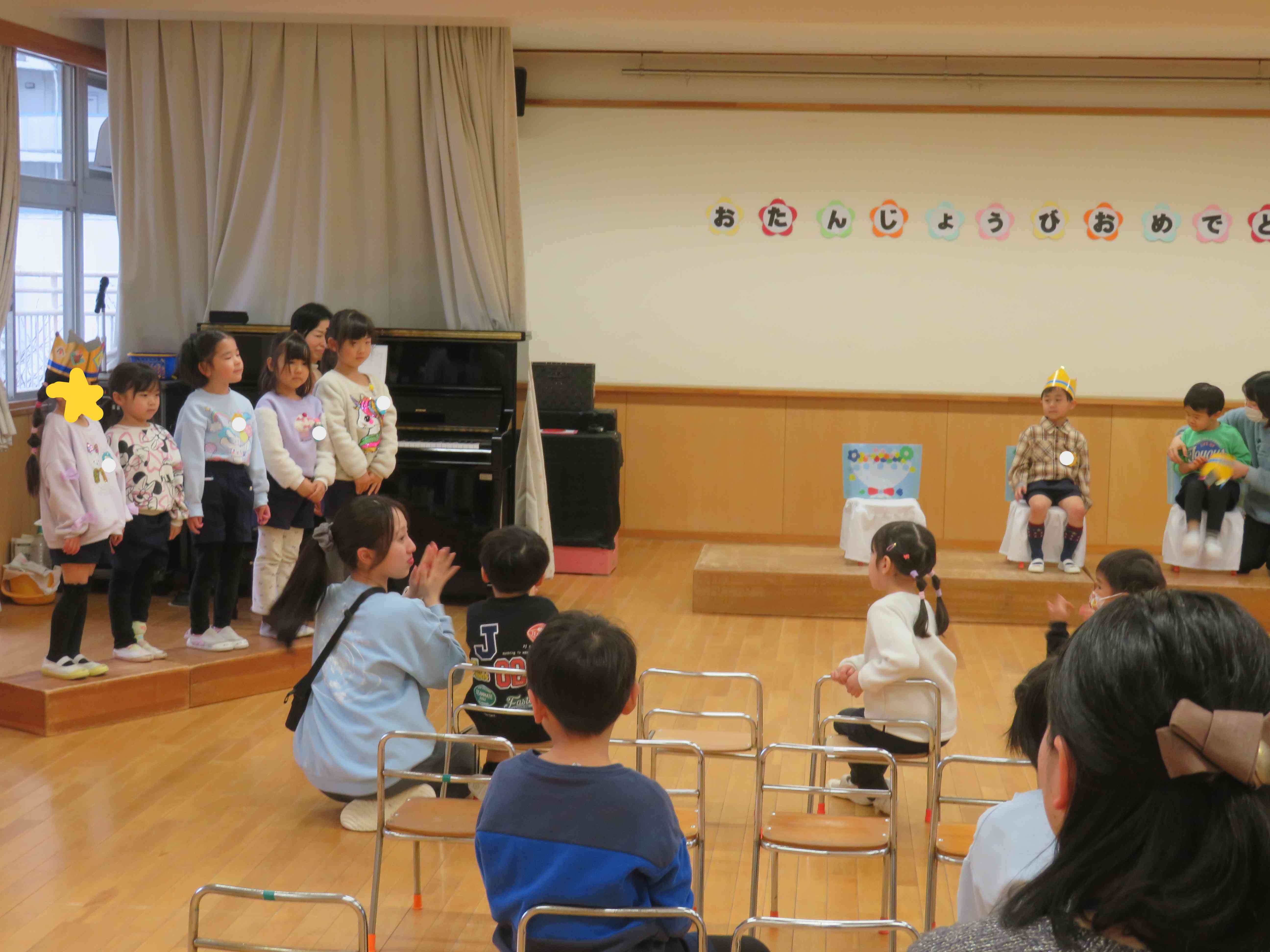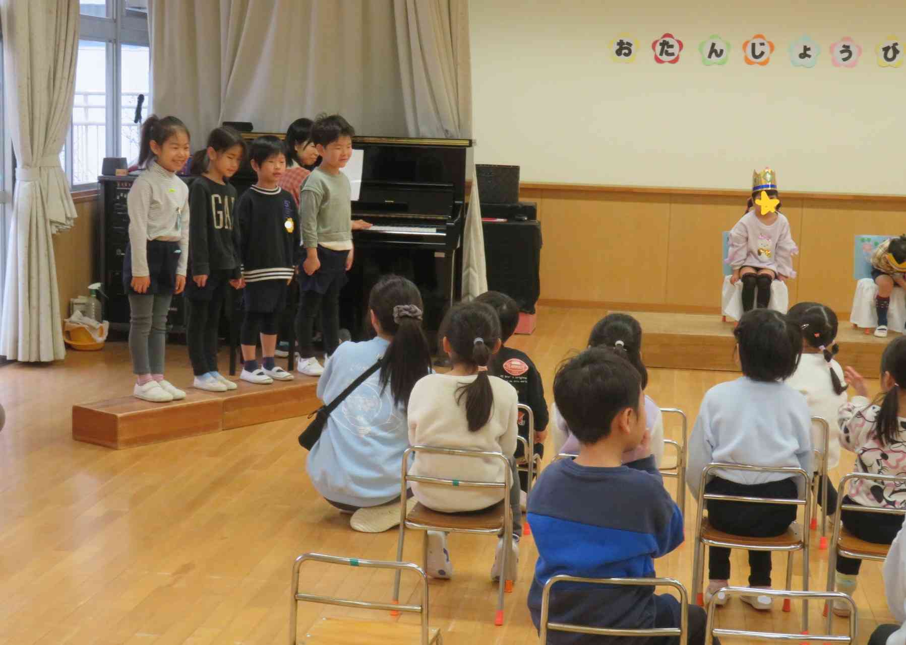 今日は年長そら組さんと年中ひよこ組さんの司会で誕生会を行い、みんなで2月生まれのお友達をお祝いしました。 園長先生の今月の小さなお楽しみは、不思議な果物の絵カードでした♪みかんとりんごの絵が描いてある絵カードが、最後にはなぜかどちらもみかんの絵になってしまいましたね。 そして、みんなのお楽しみは「たんじょうづきなかま」です。お家の方の加わって、自分の誕生月の仲間と踊り、最後はみんなで踊る楽しいダンスでした♪ 最後に今まで司会を行ってきたそら組さんから「次はひよこ組さんだけで、司会できそうだね!」と司会のバトンを受け渡されました。【添付ファイル】